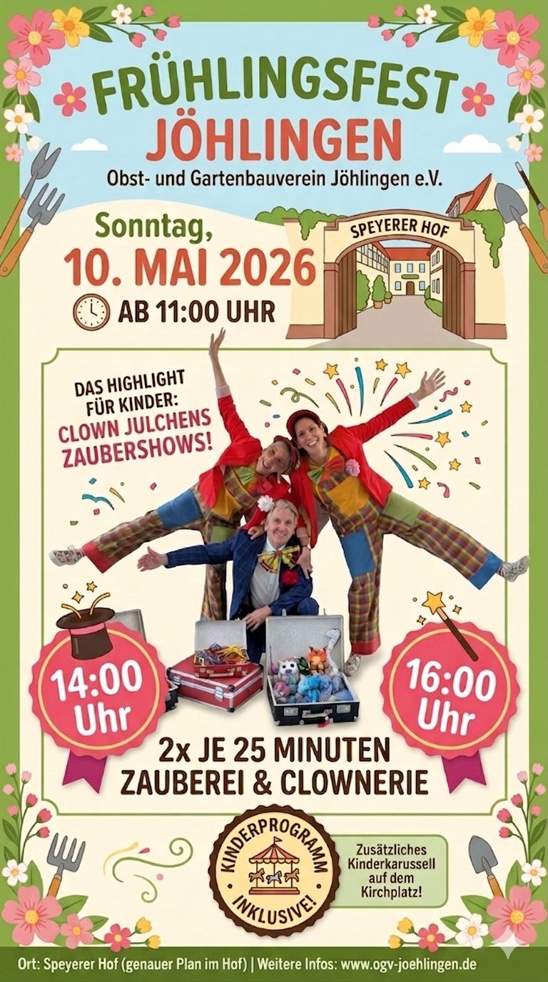 Der Obst- und Gartenbauverein Jöhlingen lädt zum großen Frühlingsfest am 10. Mai 2026 ein! Genießt einen Tag mit toller Gemeinschaft, gutem Essen und einem Programm, das Kinderaugen zum Leuchten bringt. ✨